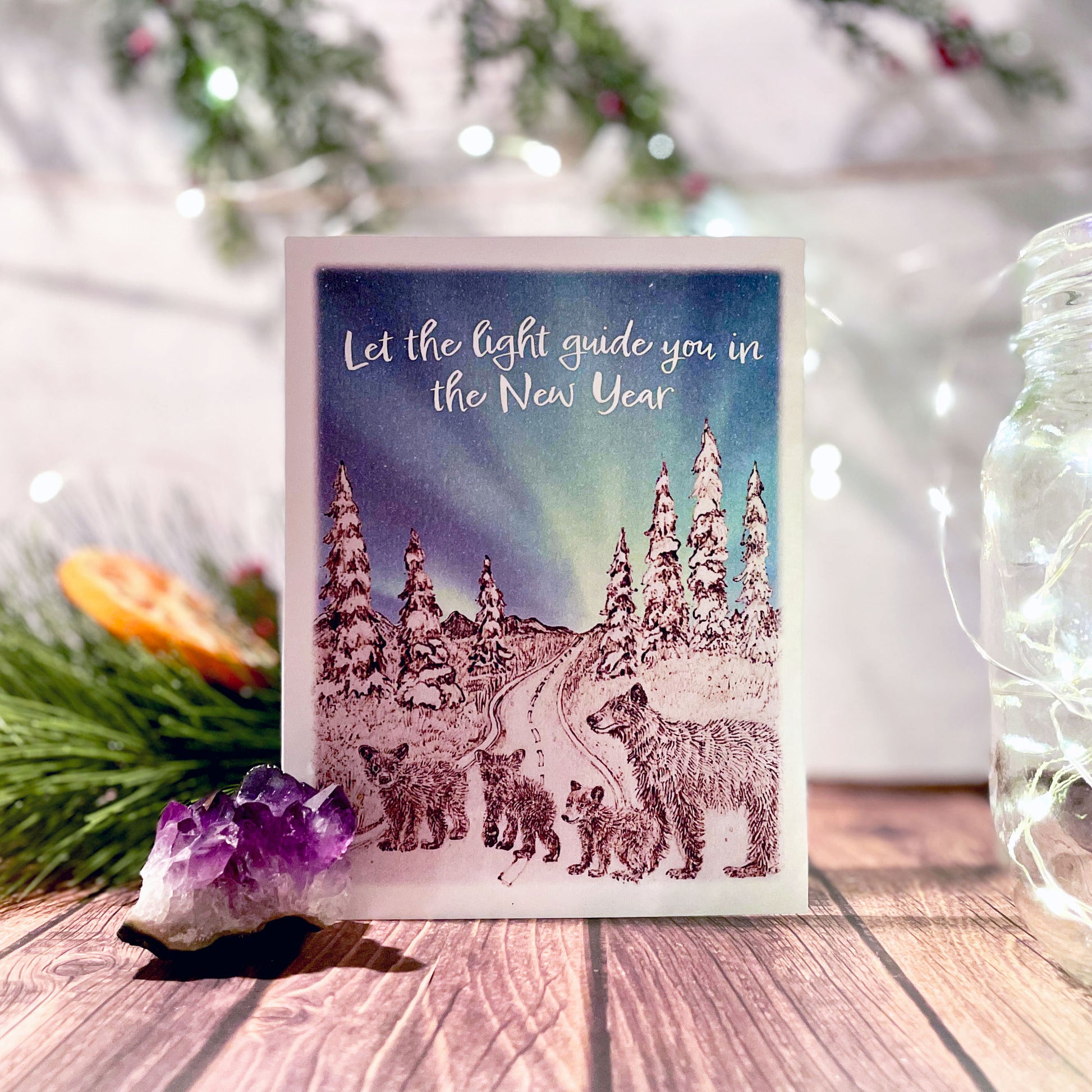 Celebrate the New Year with a touch of magic. ✨ This beloved design features a bear family walking along a snowy path, guided by the glow of the northern lights - a symbol of the bright possibilities ahead. Originally illustrated using hand-drawn pyrography, the artwork is digitally layered with the Aurora Borealis for an enchanting effect.